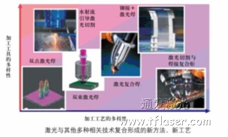 就拿激光焊接技術(shù)來(lái)說(shuō),在激光復(fù)合工藝的發(fā)展中已出現(xiàn)了如雙點(diǎn)或雙束激光的復(fù)合、激光與電弧的復(fù)合、激光與攪拌摩擦熱復(fù)合以及激光與電阻熱復(fù)合等形式;并呈現(xiàn)與其他相關(guān)技術(shù)結(jié)合及功能延伸的趨勢(shì),如與水射流、鉚接等結(jié)合而形成的新工藝(見圖)。