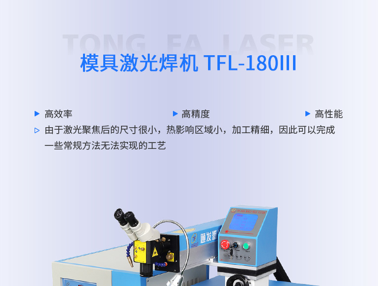 普通型模具激光焊機TFL-180Ⅲ是通發激光公司的模具激光焊機中銷量較大的傳統型,配置激光頭手搖升降與工作臺按鈕電動升降實現焊接不同厚度模具的激光焊加工。本系列機型適用于各類精密注塑模具激光補焊、壓鑄模具激光修補焊接;同時也適合鑄件沙孔激光修補、模具磨損激光修復、過切加工等的激光修補;各類金屬結構件激光焊接加工、不銹鋼首飾激光焊接加工。
